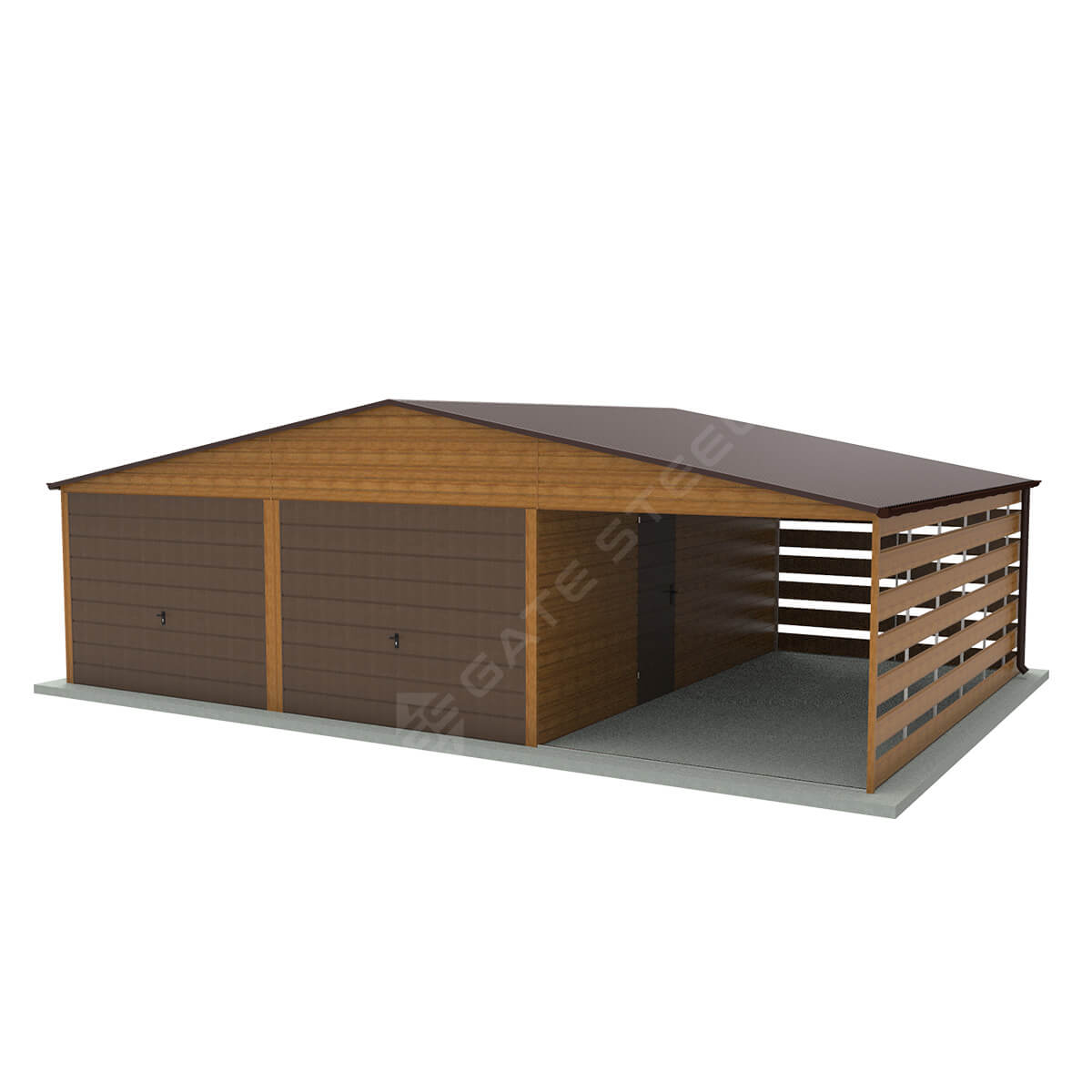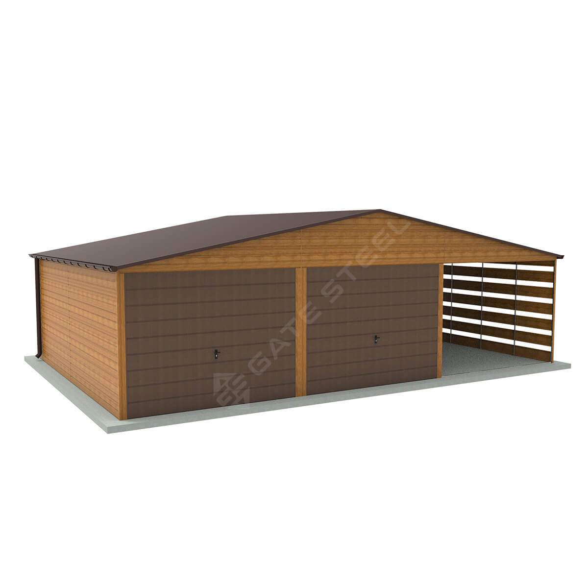Istnieje możliwość doświetlenia garażu dwuspadowego z wiatą poprzez zamontowanie okien uchylnych o wymiarze 80 x 60 lub 120×60. Stosujemy kolory blach: orzech, złoty dąb, grafit, brąz. Cieknąca woda z dachu może zostać poskromiona poprzez montaż systemu rynnowego, rynna + rura spustowa w trzech kolorach: brąz, grafit, czarny.