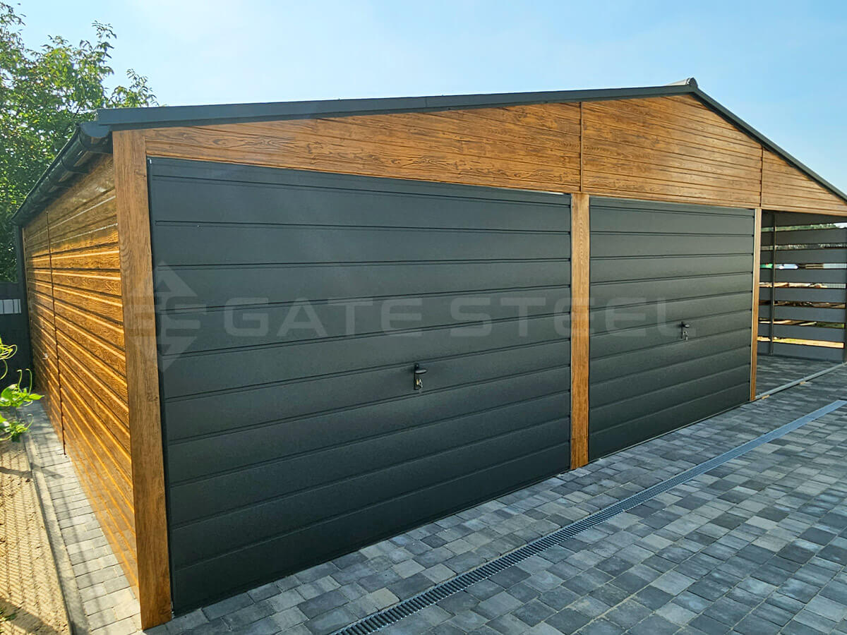 Złoty Dąb + Antracyt/Grafit MAT Garaż Dwuspadowy Dwie Bramy Premium 6m x 5m