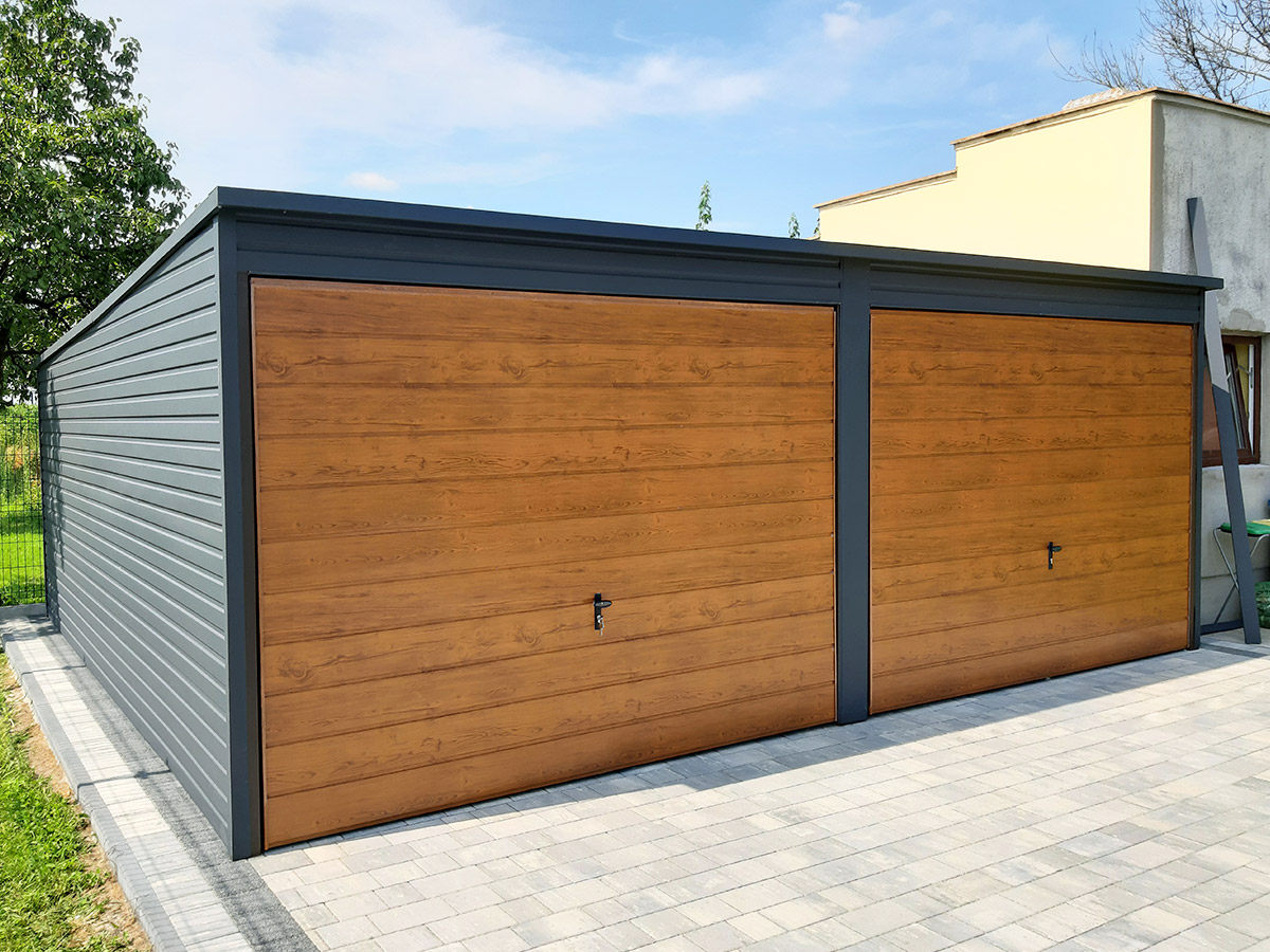 Złoty Dąb + Antracyt/Grafit MAT Garaż Dwuspadowy Dwie Bramy Premium 6m x 5m