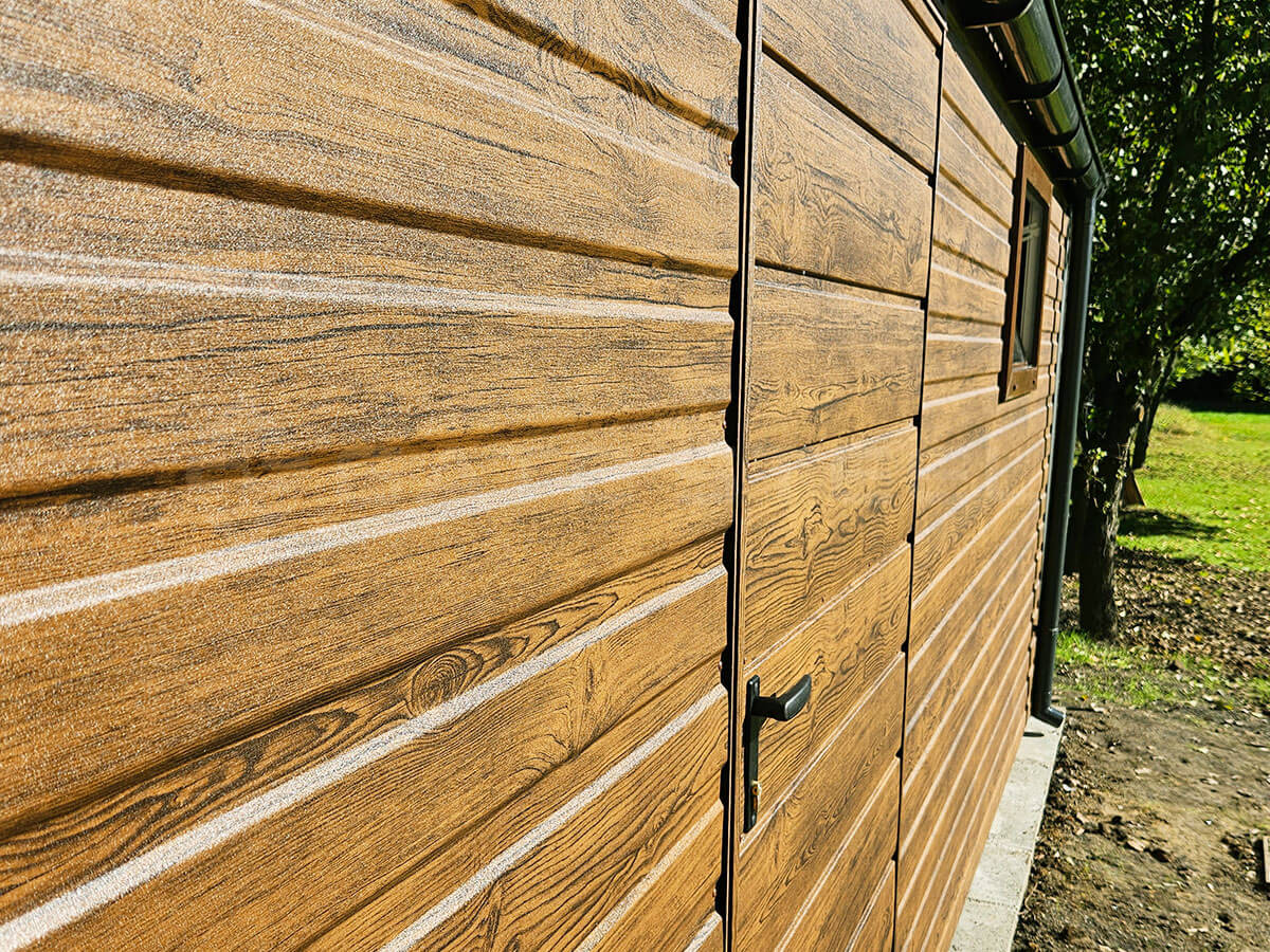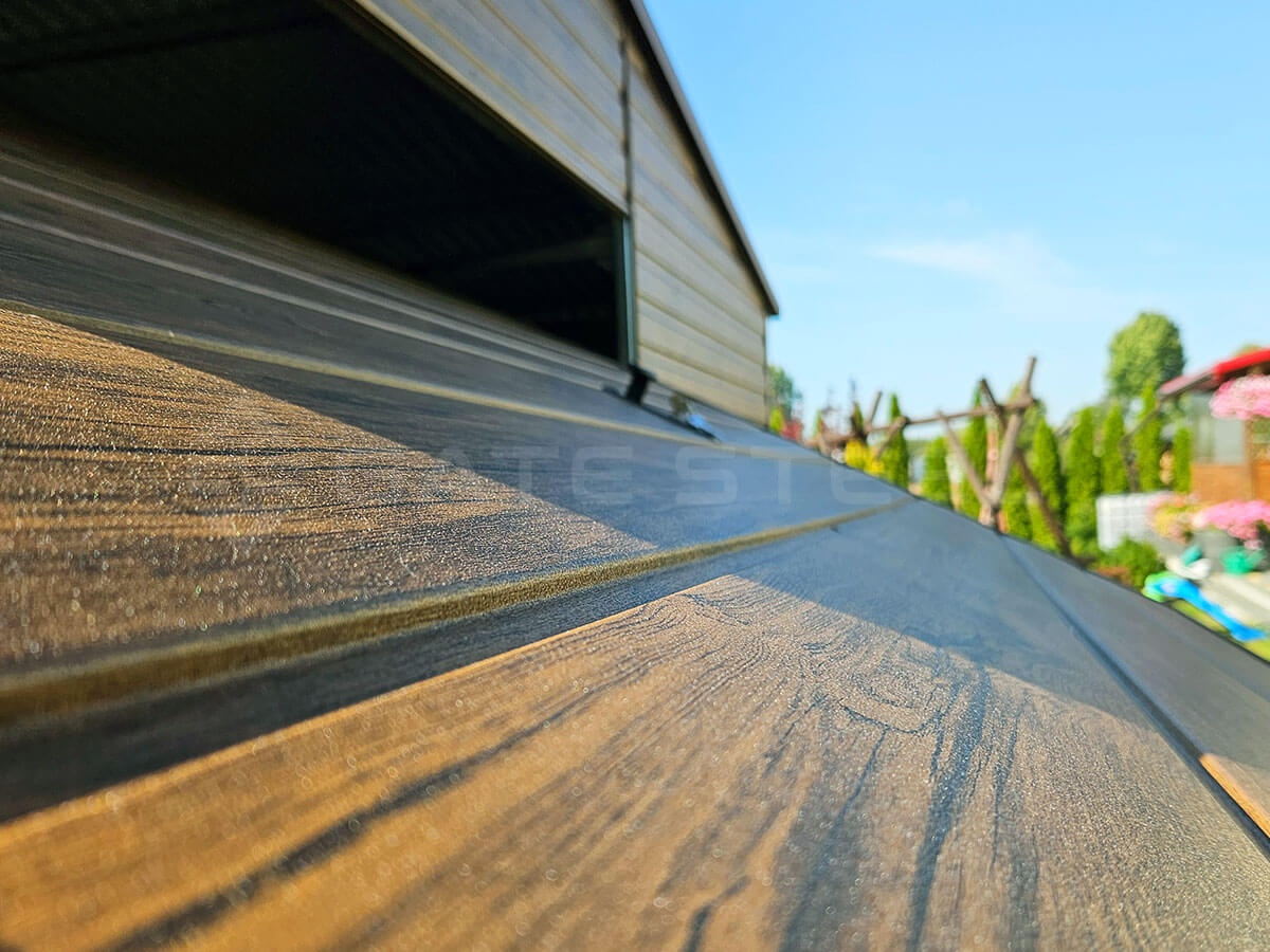- Wzory blachy drewnopodobnej, czyli struktura drewna: Orzech ciemny, Orzech jasny, Złoty dąb. Dodatkowo standardowa blacha ocynkowana.
