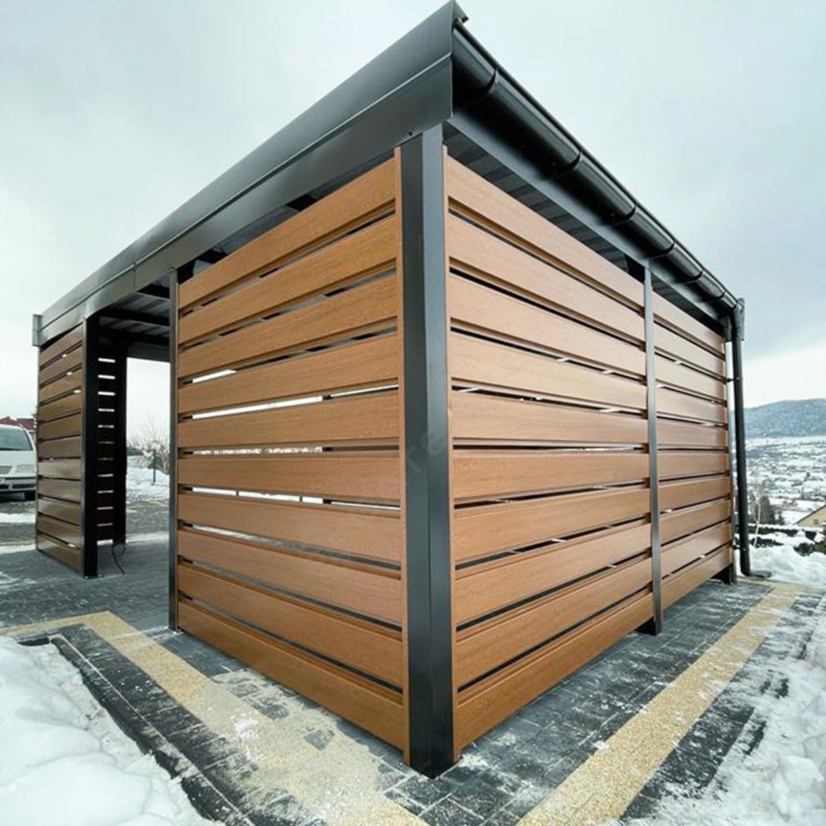 Wiata carport 4m x 6m, konstrukcja stalowa. Wymiary: szerokość 4,0m, długość 6,0m. Spadek dachu do tyłu, wysokość z przodu 270 cm, z tyłu 258 cm. Jest to konstrukcja wolnostojąca, nie posiadająca bramy oraz drzwi. Wypełnienie – profil zamknięty z blachy drewnopodobnej w kolorze złoty dąb (kolor dwustronny). Na dachu blacha trapezowa t-35 RAL 9005 (czarny połysk). Orynnowanie w standardzie, całości dopełniają obróbki blacharskie. Przy produkcji, duży nacisk kładziemy na estetykę wykonania, dbamy o każdy szczegół, aby miejsce postojowe dla Twojego samochodu, było idealnie dopasowane do otoczenia.